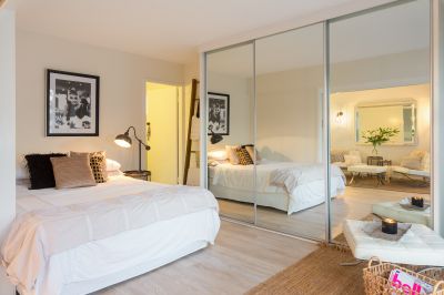 A double built in wardrobe with additional built in cabinetry and mirror sliding doors.