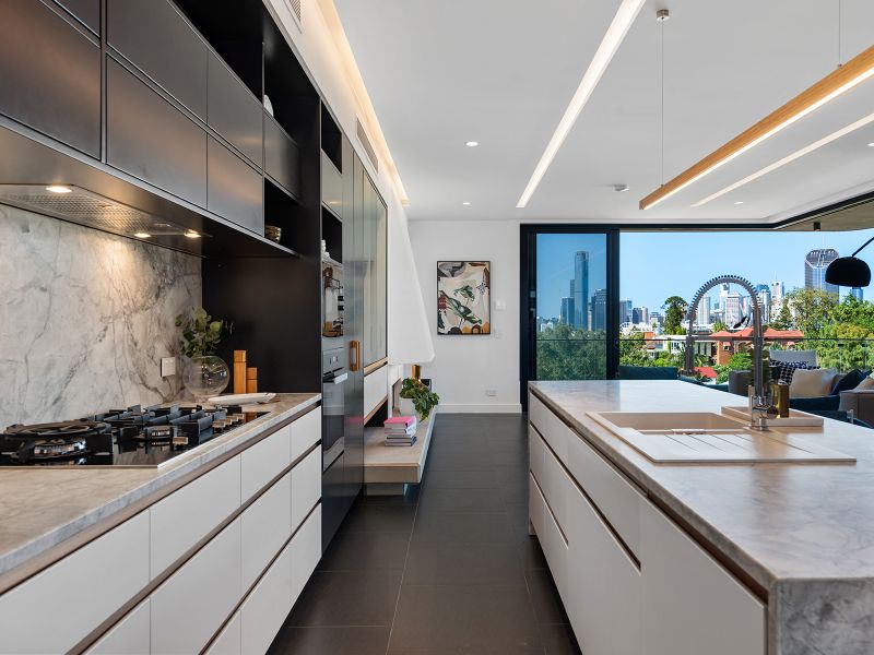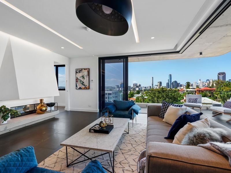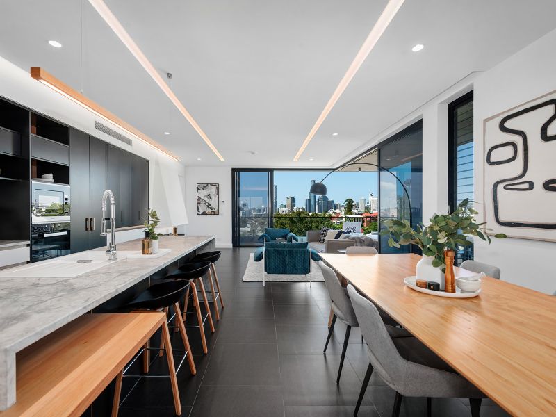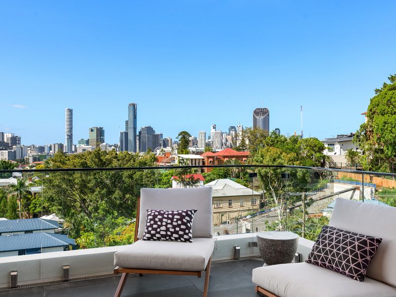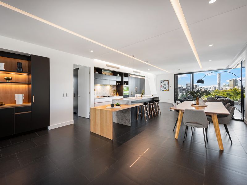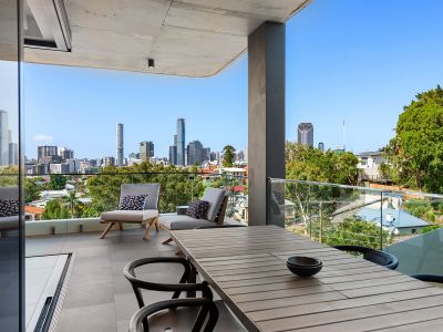 Architecturally exquisite yet aptly designed for practicality. This sky home is set out with a beautiful flow from indoor living to adjoining generous balconies to capture sunlight and cross breezes. Multiple terraces boast sweeping broad views across the city skyline, over to Mt Coot-tha as well as panoramas across the Brisbane River over to St Lucia.