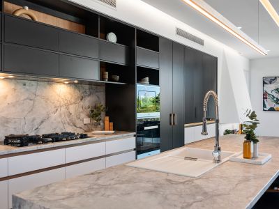 * Gallery-style kitchen complete with integrated Miele appliances, sleek waterfall benchtops, contrasting timber breakfast bar flourished with elegant rose-gold accents