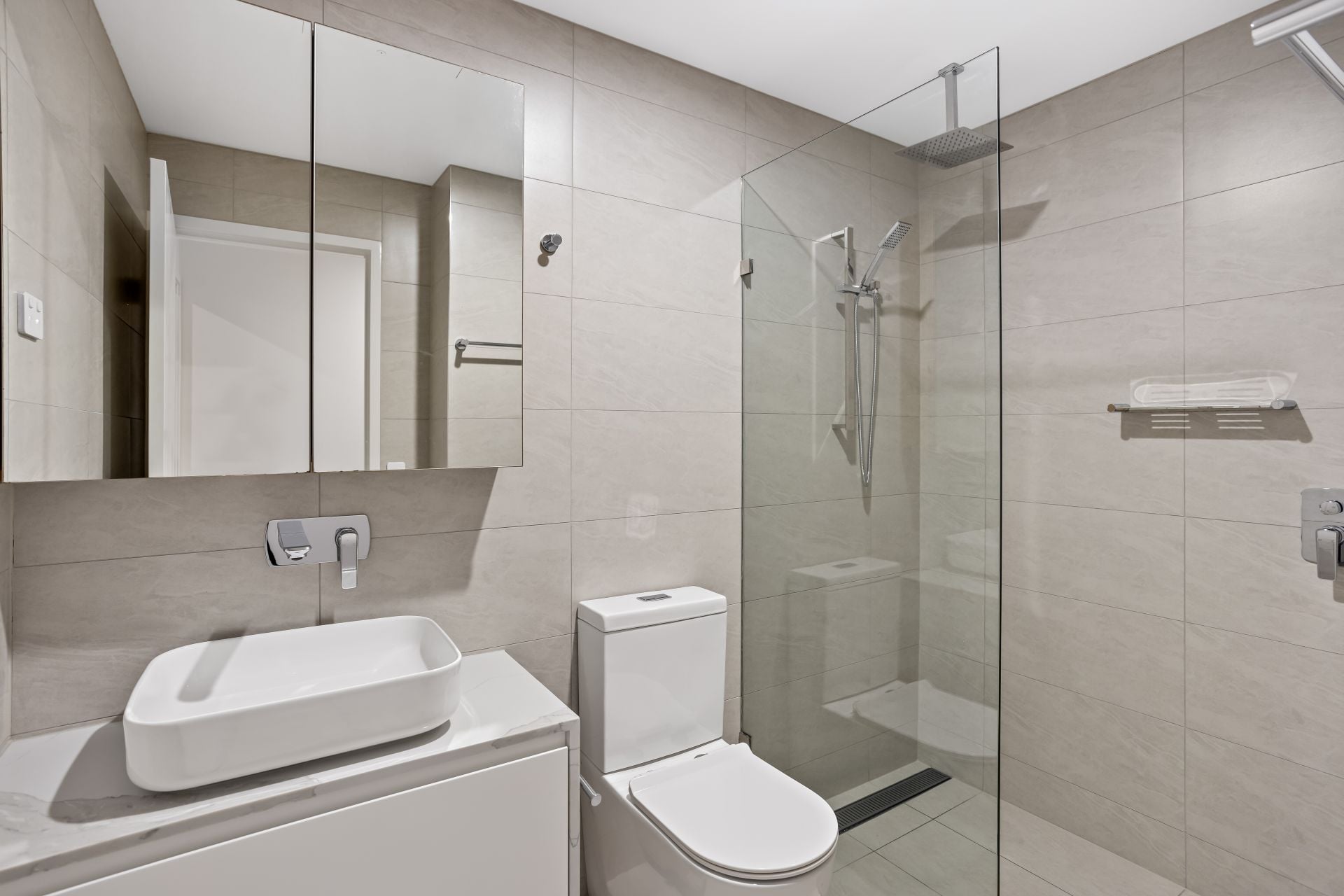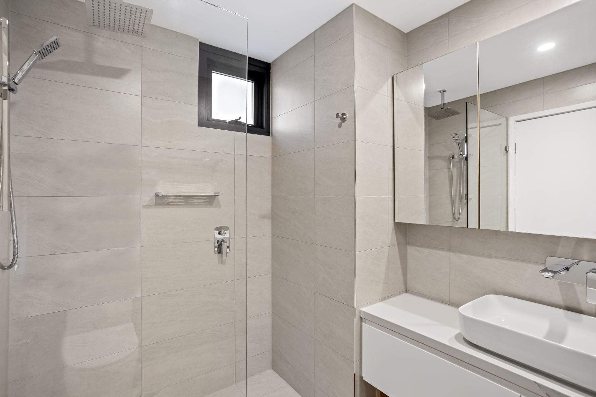 This modern apartment boasts a spacious open-plan kitchen and living area that seamlessly extends to a relaxing terrace, perfect for year-round enjoyment. Floor-to-ceiling glass doors and windows flood the space with natural light, creating a warm and inviting atmosphere. The sleek kitchen is equipped with an electric cooktop, a tucked-away pantry, and an oversized ceramic sink, catering to both style and functionality.
