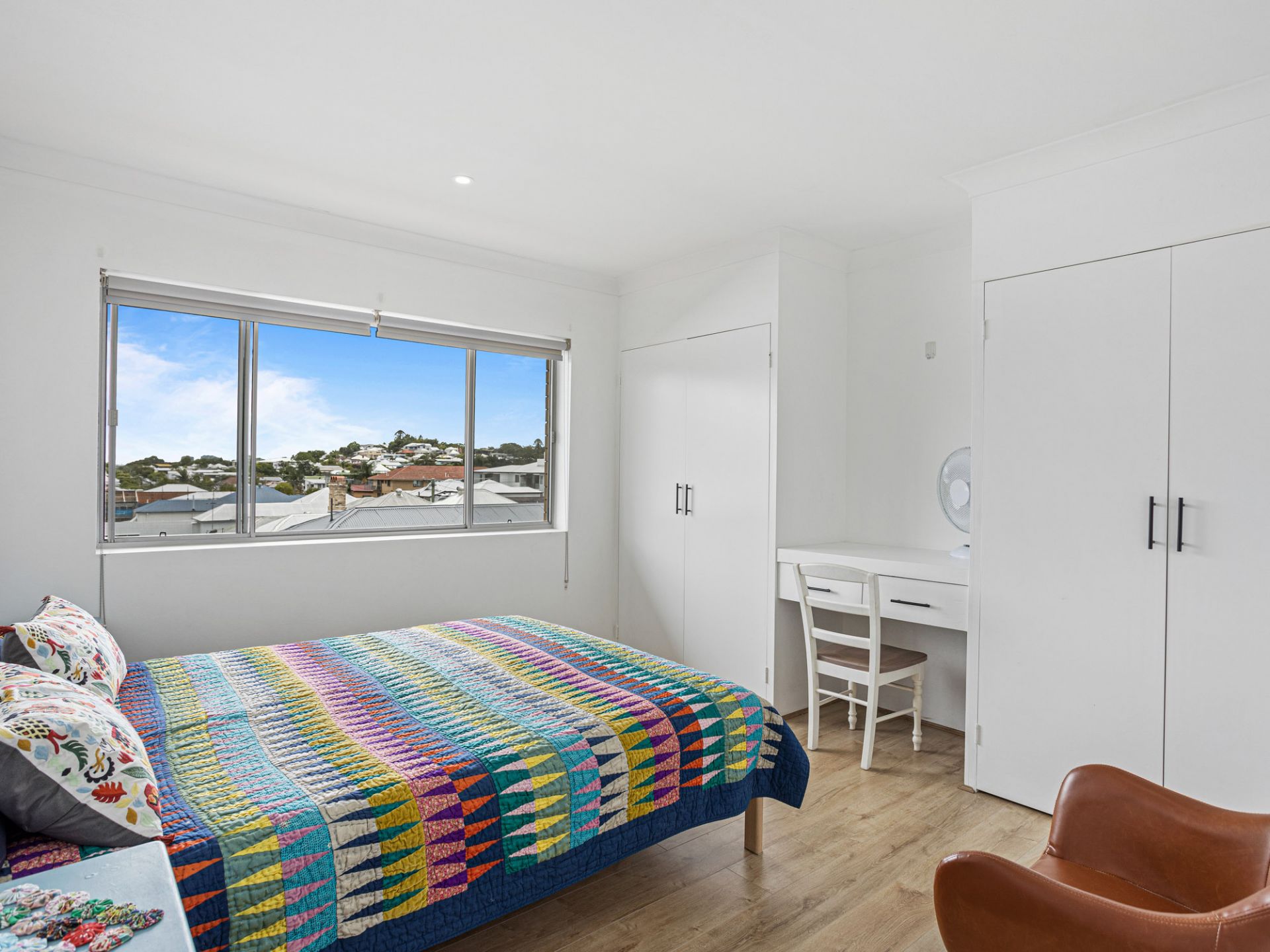 There are two good-sized bedrooms serviced by a large, centrally located bathroom. The main bedroom has his and hers built-in robes divided by a study nook. The second bedroom features plenty of space to use as a study, or simply pull out the sofa-bed for guests.