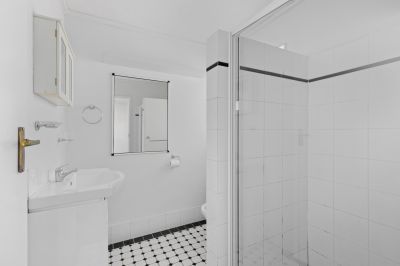 - Neat bathroom with shower over bath and internal laundry