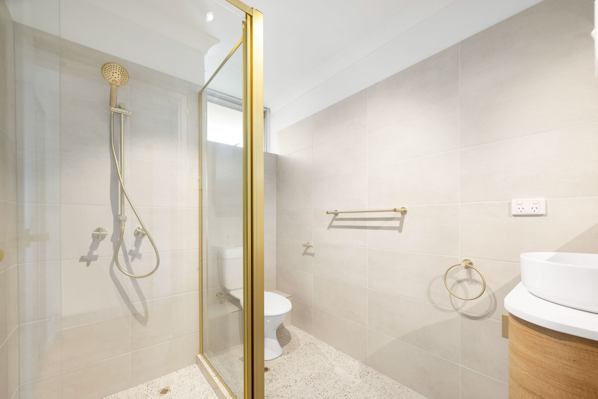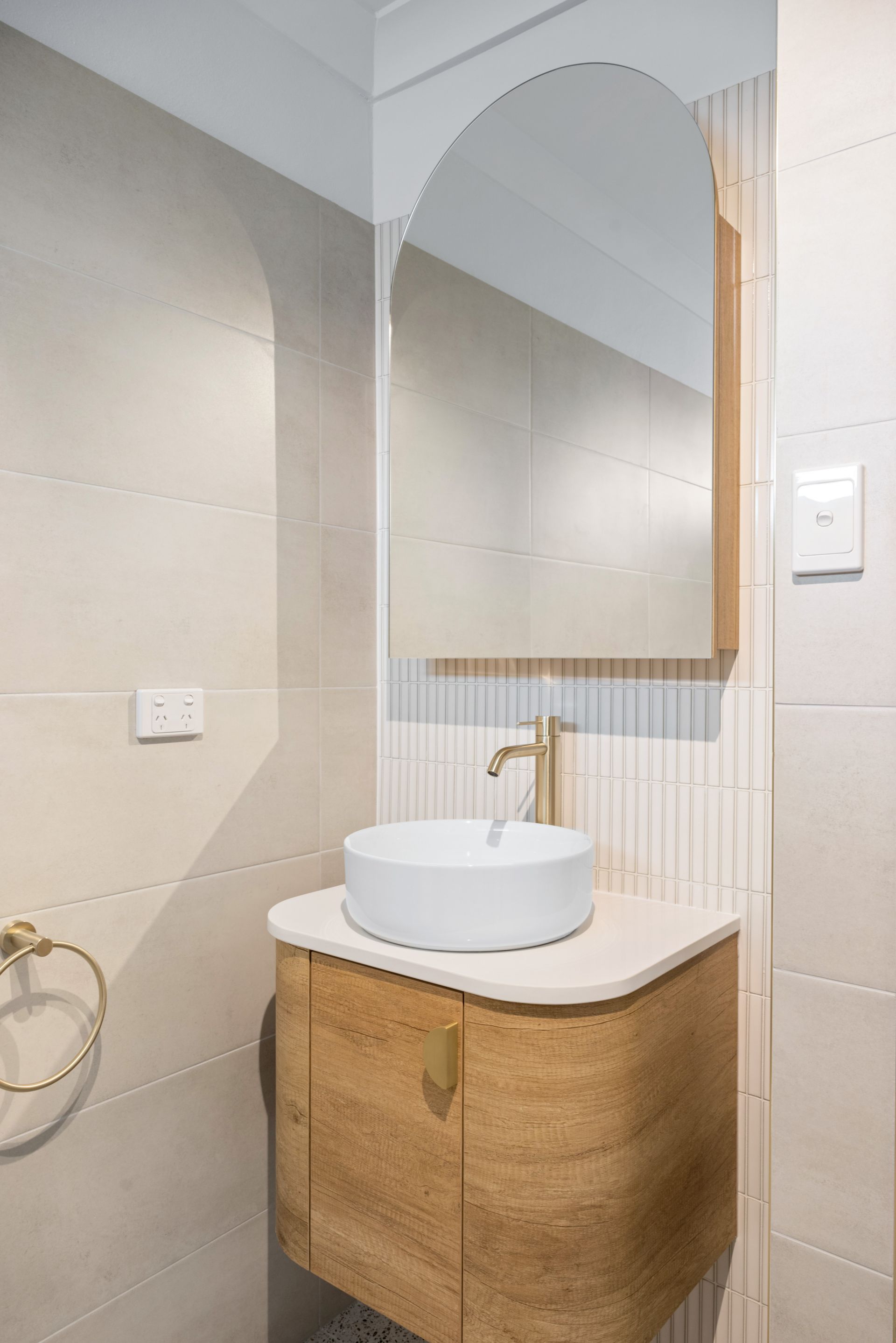 - Terrazzo tiled bathroom with oak vanity, stone benchtop & Nero tapware